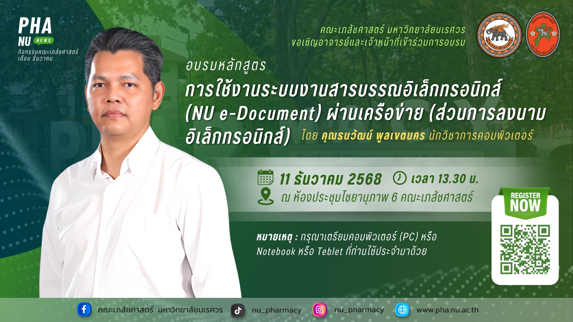 ขอเชิญบุคลากรคณะเภสัชศาสตร์ เข้าร่วมการอบรมหลักสูตร “การใช้งานระบบงานสารบรรณอิเล็กทรอนิกส์ (NU e-Document) ผ่านเครือข่าย (ส่วนการลงนามอิเล็กทรอกนิกส์)”