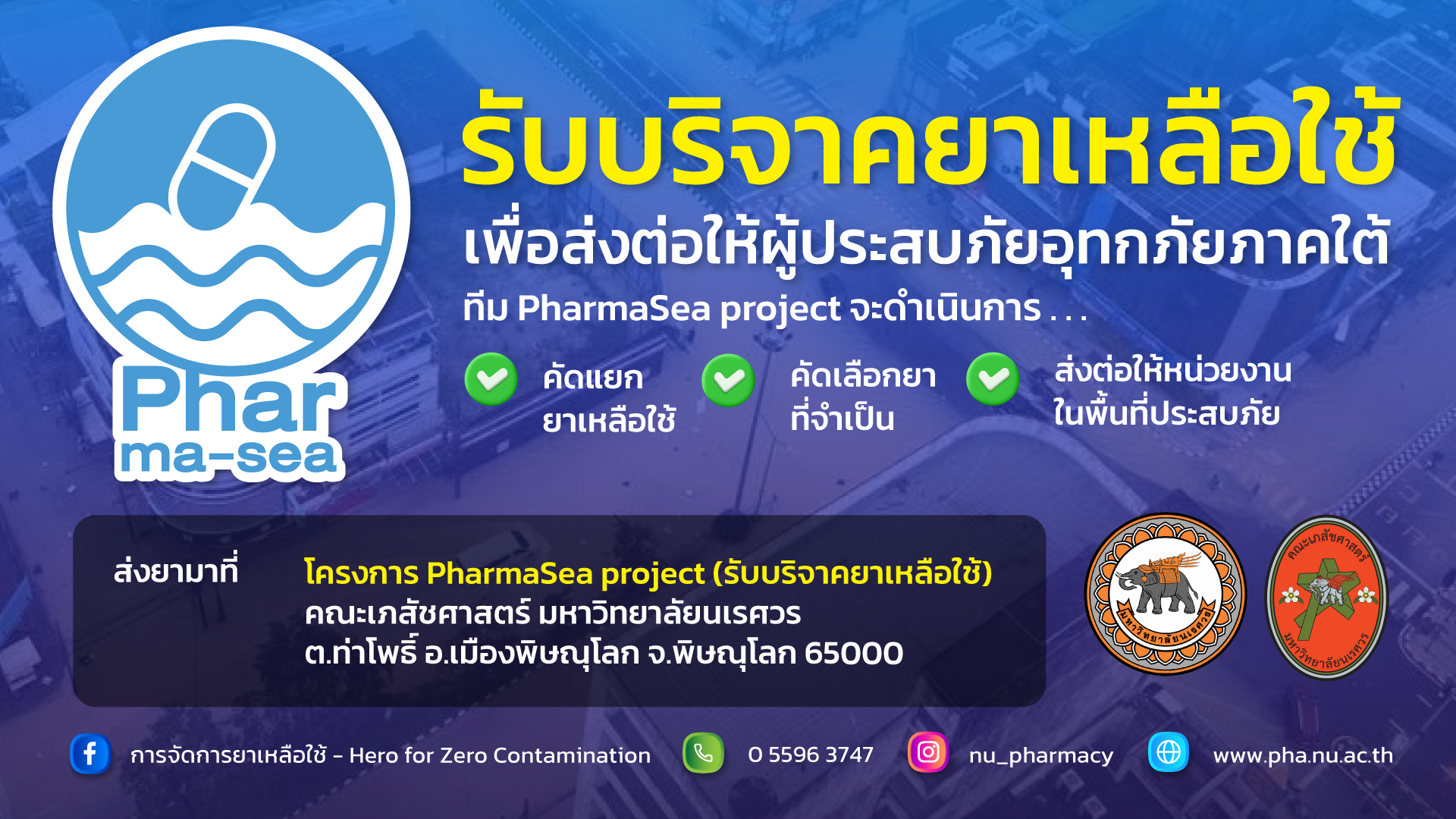 สำหรับผู้ที่ประสงค์ร่วมบริจาคสามารถจัดส่งยาเหลือใช้มาที่ โครงการ PharmaSea project (รับบริจาคยาเหลือใช้) คณะเภสัชศาสตร์ มหาวิทยาลัยนเรศวร ต.ท่าโพธิ์ อ.เมืองพิษณุโลก จ.พิษณุโลก 65000 Facebook การจัดการยาเหลือใช้ – Hero for Zero Contamination